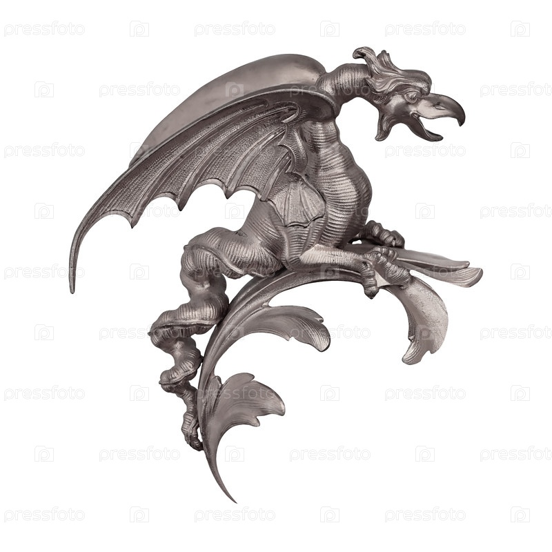 Серебряный декоративный элемент 'дракон' выделен на белом фоне