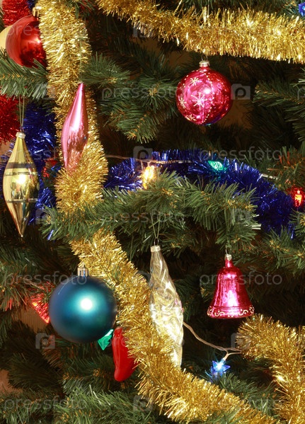 Игрушки на зеленой рождественской елке