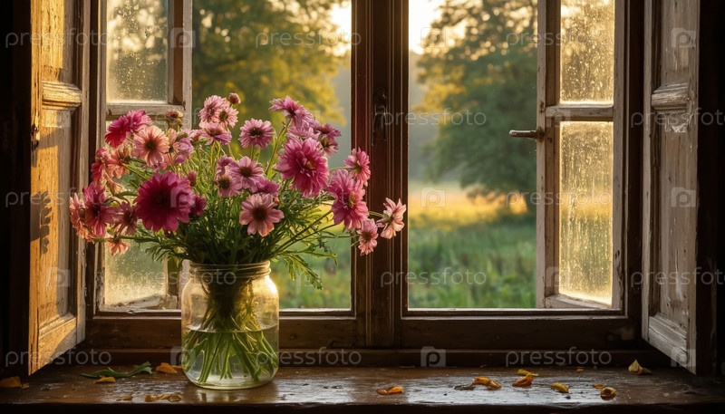 Цветы в банке на окне деревенского дома рассвет в деревне генерация ИИ
