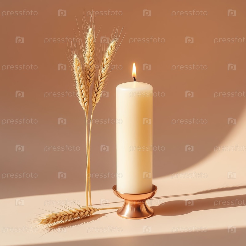 Простая высокая свеча из слоновой кости медный держатель пшеничного стебля теплый кремовый фон