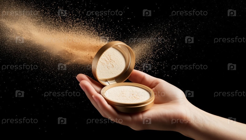 Косметический бежевый порошок в ладони женщины на черном фоне