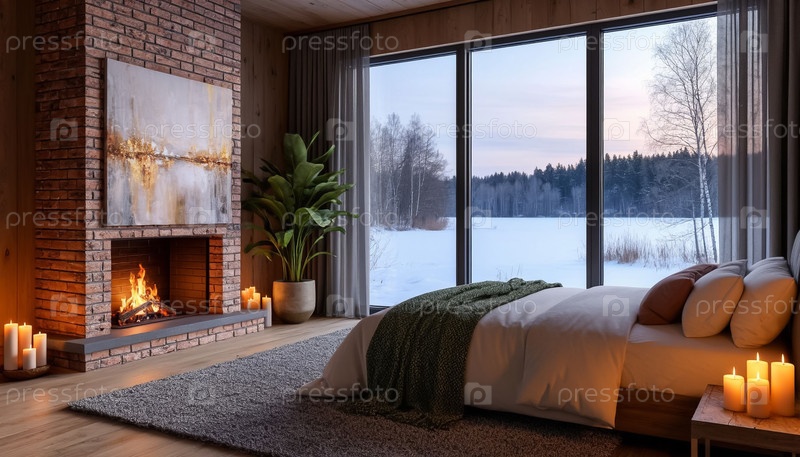 Интерьер уютной спальни для романтических выходных Камин, свечи, панорамные окна, коттедж, отель