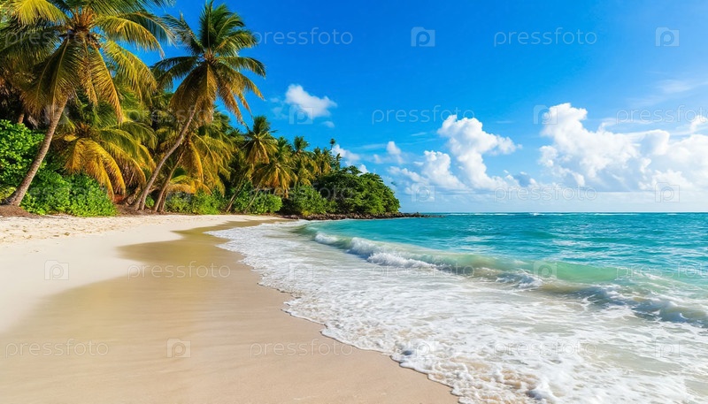 Красивый пляж с белым песком, пальмами и голубой морской водой