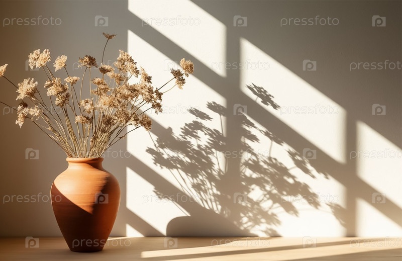 Солнечный свет освещает стену и керамическую вазу с сушеными цветами