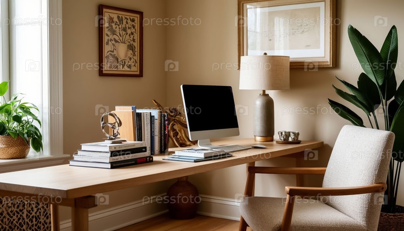 Интерьер рабочего места возле окна в светлых цветах. комфорт и чистота. генерация ИИ