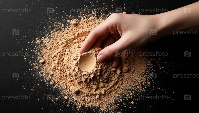 Рука взаимодействует с бежевым порошком на черном фоне