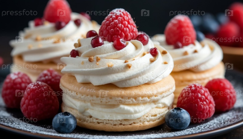 Воздушный торт со сливкой и ягодами на темном фоне