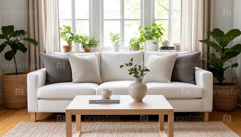 Естественный белый диван с подушками на солнце, спокойный интерьер