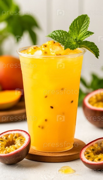 Желтый лимонад с манго и страстными фруктами в стакане