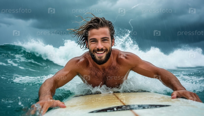 Красивый мужчина с бородой во время шторма и грозы в море на доске для серфинга