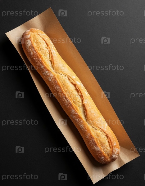 Хрустящий багет в ремесленной упаковке на черном фоне