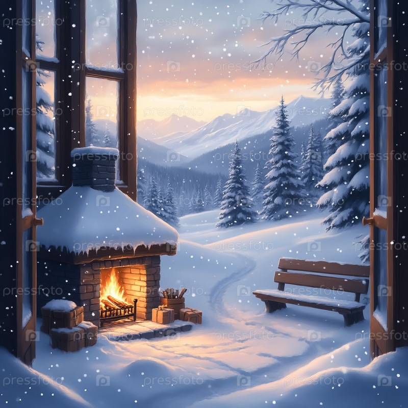 Уютный беседка с видом на камин снежного пейзажа