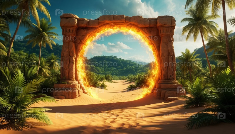Светящийся портал посреди пустыни, ведущий в тропический лес