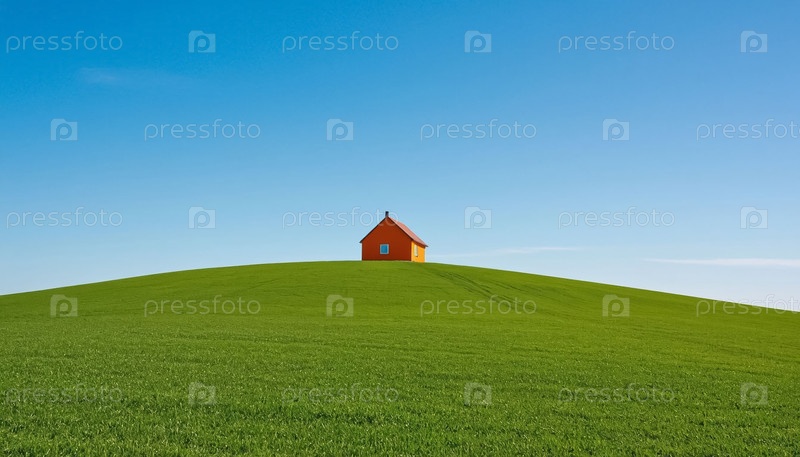 Сырой летний пейзаж одинокий дом на вершине зеленого холма