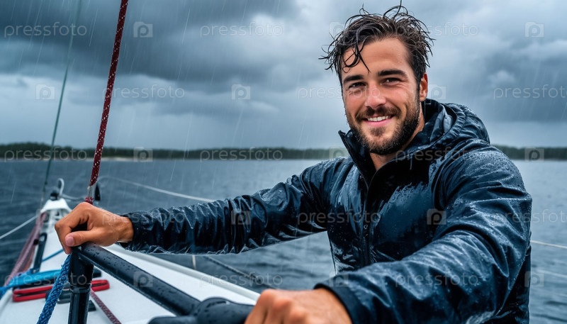 Красивый мужчина с бородой управляет яхтой во время шторма, дождя и грозы