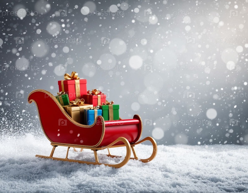 Красные сани с подарками в заснеженном снежном дрейфе Рождество Новый год генерация ИИ