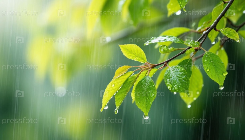 Ветвь с зелеными листьями, дождь