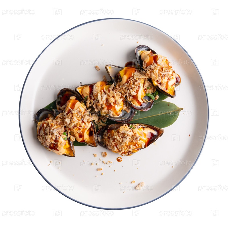 Вид сверху выпеченной мидии со сливочным сыром, соусом териаки и хрустящей начинкой на бамбуковом листе на белой тарелке, изолированной на белом фоне