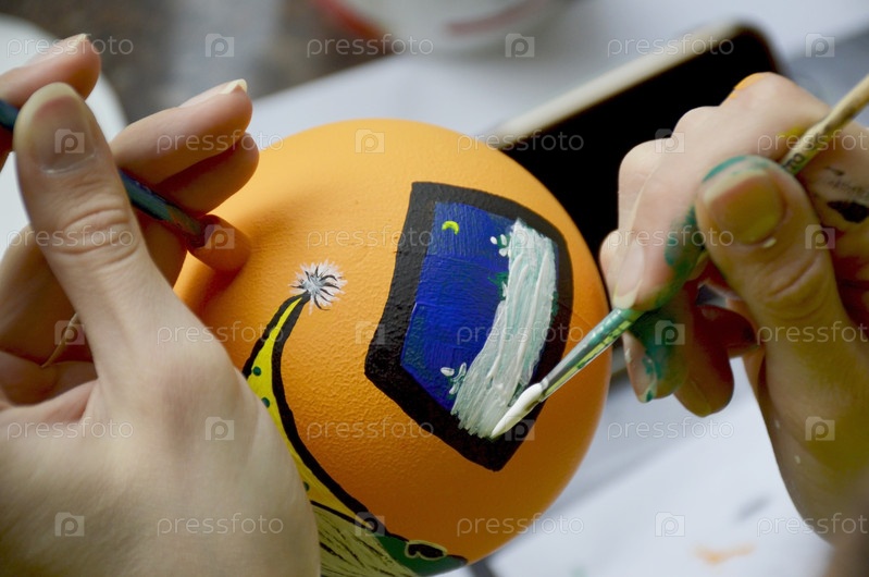 Женские руки тщательно рисуют ярко окрашенный рождественский шар, используя кисть, чтобы нарисовать на его поверхности силуэт окон и деревьев в снегу