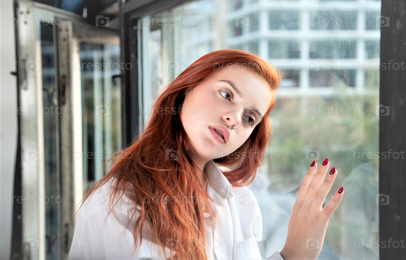 Красивая рыжеволосая девушка в белой рубашке у окна