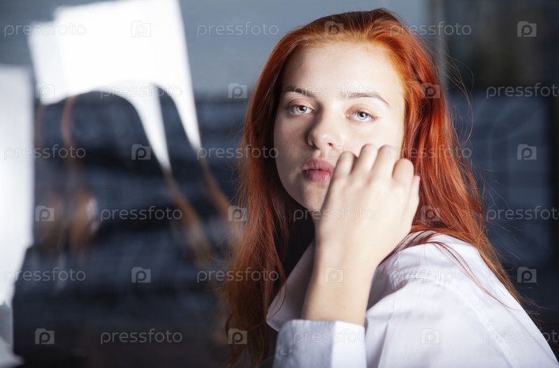Красивая рыжеволосая девушка в белой рубашке
