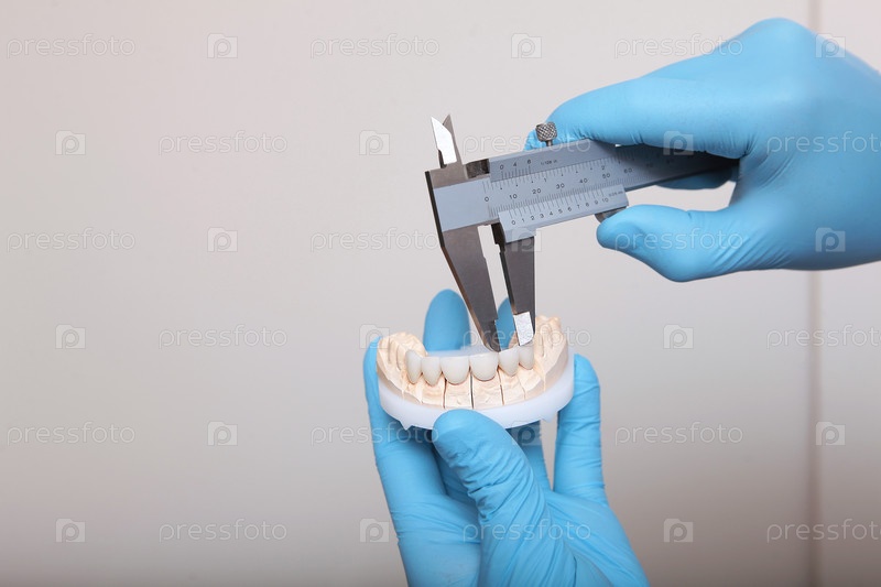 Керамические и композитные фанеры. Стоматолог измеряет фанеры. Руки в защитных перчатках. Концепция красоты и здоровья. Копировать пространство. Закрытие