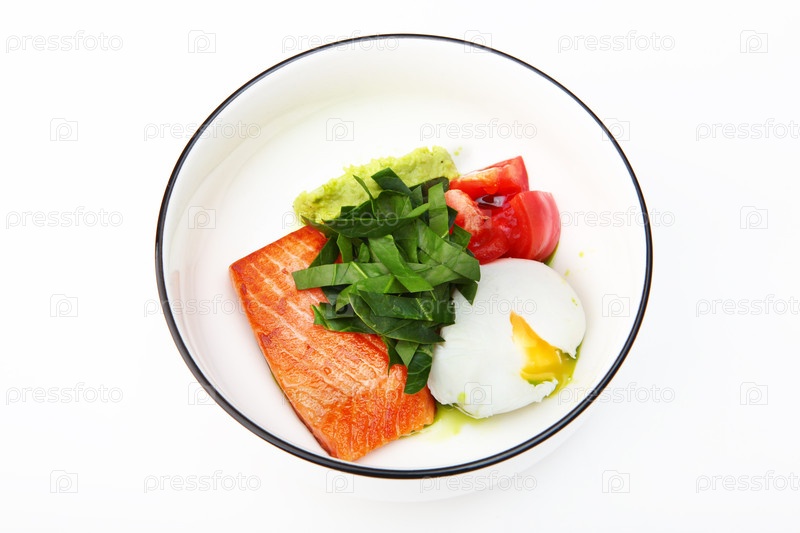 Здоровый завтрак. Завтрак с яйцами и красной рыбой. Природные омега. Плоская. Вид сверху. Копировать пространство. Изолированный объект