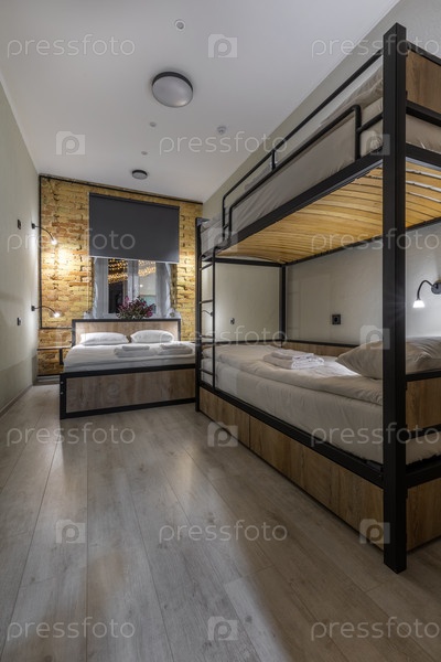 Интерьер современного общежития в стиле промышленной чердаки ночью. он имеет большую двуспальную кровать с открытой кирпичной стеной, деревянную двухъярусную кровать с металлическими рамами и уютным освещением. чистый, функциональный дизайн для групп или