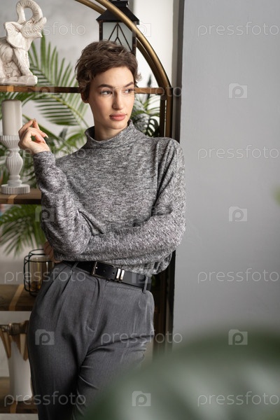 Красивая молодая женщина позирует в сером свитере в студии