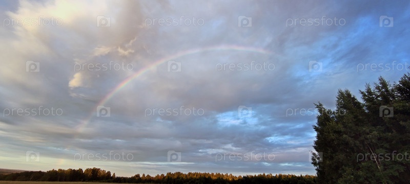 Летняя радуга над полем. светло-синее небо с бело-серыми кумулярными облаками. Радуга светит в небе, она имеет форму длинной дуги и состоит из семи цветов. Ниже находится поле и лес