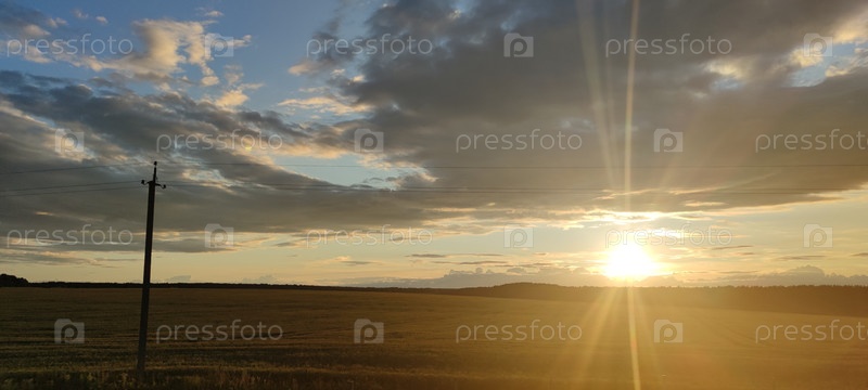 Зелёное поле на закате. В летний вечер небольшие кумулярные облака висят в голубом небе. Под ними зеленое поле с высокой травой и дикими цветами. На расстоянии солнце заходит ниже горизонта