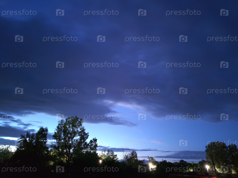 Ночное небо над деревней.Позднелетний вечер на расстоянии, небо светит белыми серыми облаками, плавающими по небу.Под ними можно увидеть темные силуэты деревьев и крыши сельских домов