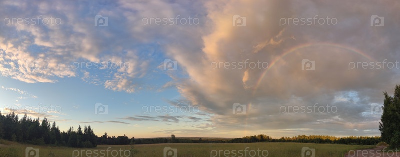 Летняя радуга над полем. светло-синее небо с бело-серыми кумулярными облаками. Радуга светит в небе, она имеет форму длинной дуги и состоит из семи цветов. Ниже находится поле и лес
