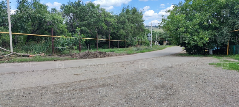 Светло-голубое небо над дорогой. Широкая поляна между высокими деревьями, где проходит шоссе. На краях дороги есть деревья с зеленой лиственницей. Облака плавают по небу