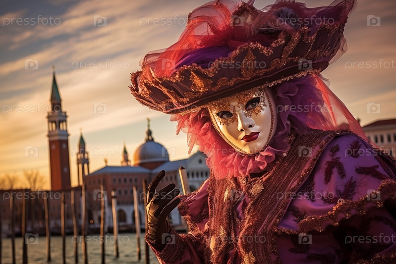 Мужчина, украшенный богато детализированным и красочным карнавальным костюмом в комплекте с сложной маской, участвует в знаковом Венецианском Карнавале