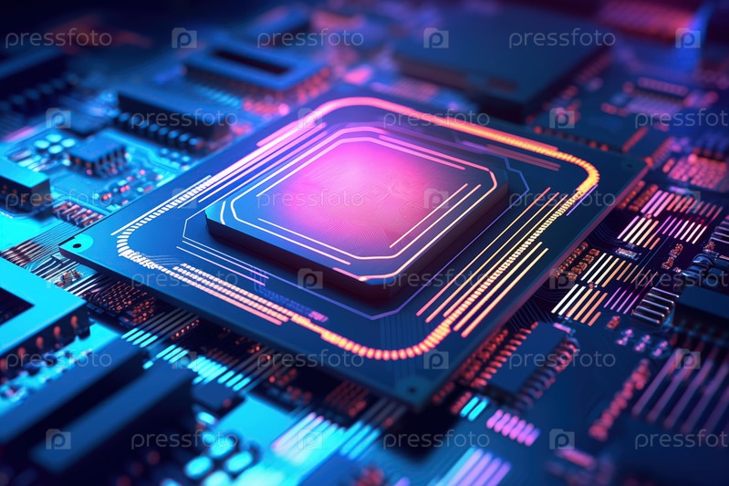 Закрытие процессора ЦП на материнской плате с помощью светящихся неоновых огней Чип окружен другими электронными компонентами Технология и аппаратный контент