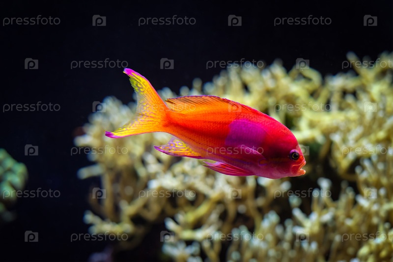 Квадратная antima Pseudanthias pleurotaenia рыба под водой в море с кораллами на заднем плане