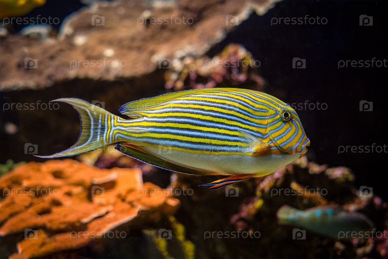 Линейная рыба-хирург Acanthurus lineatus под водой с кораллами на заднем плане