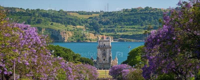 Прекрасный вид на башню Белема в Лиссабоне, Португалия, виден над улицей с цветущими фиолетовыми цветковыми деревьями Джакаранды с туристическими парусными лодками по реке Тегу при закате