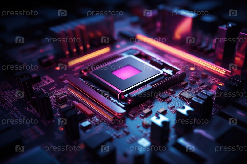 Закрытие процессора ЦП на материнской плате с помощью светящихся неоновых огней Чип окружен другими электронными компонентами Технология и аппаратный контент