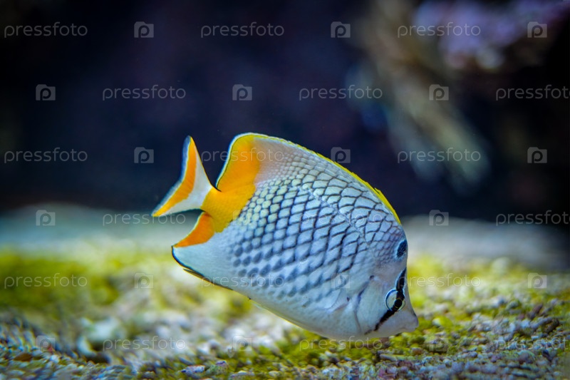 Жемчужная бабочка Chaetodon xanthurus рыба под водой в море с кораллами на заднем плане