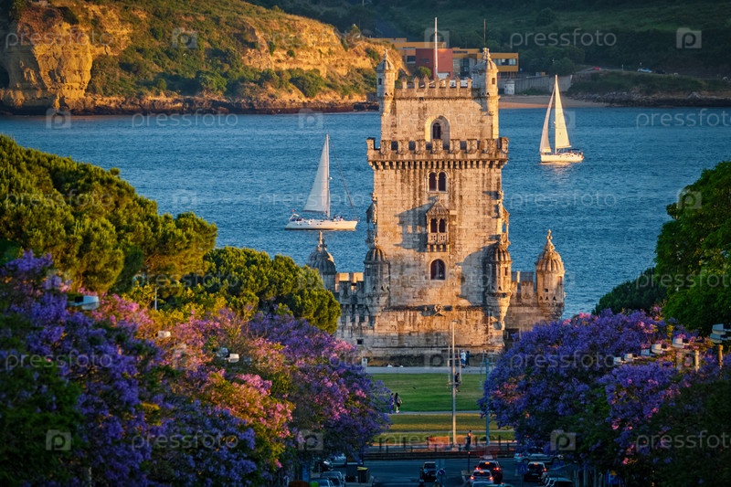Башня Белем в Лиссабоне, обрамленная цветущими деревьями Джакаранды и парусными лодками на реке Тагус, Португалия