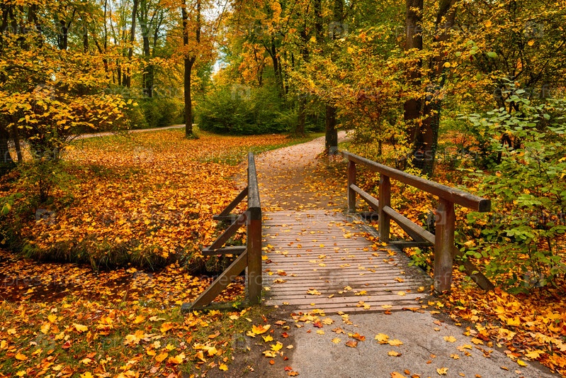 Английский сад Englischer Garten Park Осенние цвета на деревьях и листьях, а также старый деревянный мост через ручей