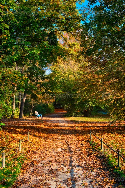 Золотая осень октября в знаменитом Мюнхенском месте отдыха - английский сад с пешеходами и велосипедистами. английский сад со упавшими листьями и золотым солнечным светом. мюнхен, бавария, германия