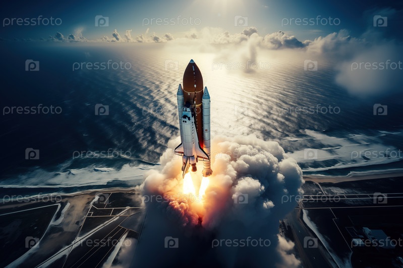 Вид с воздуха ракеты-носителя на рассвете над берегом океана.Ракета взлетает со следом дыма и пламени позади себя