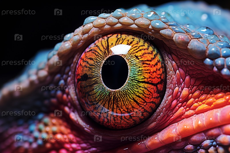 Яркое крупное изображение, захватывающие сложные детали и яркие цвета глаз хамелеона на темном фоне