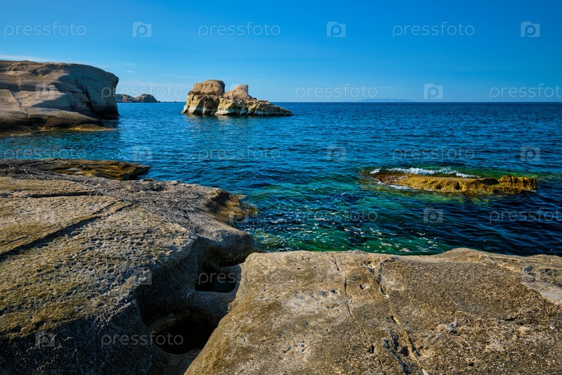 Белые скалы знаменитой туристической достопримечательности острова Милос Саранико пляж и Эгейское море, Остров Милос, Рис