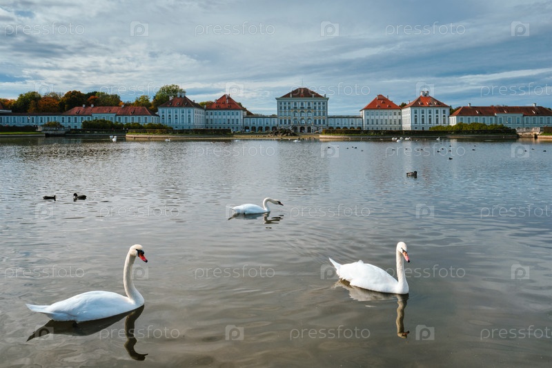 Лебедь в пруду возле Нимфенбургского дворца.Мюнхен, Бавария, Германия