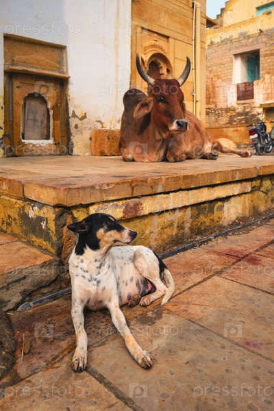 Корова и собака спят на улице.Корова является священным животным в Индии.Форт Джациалмер, Раджастхан,Индия