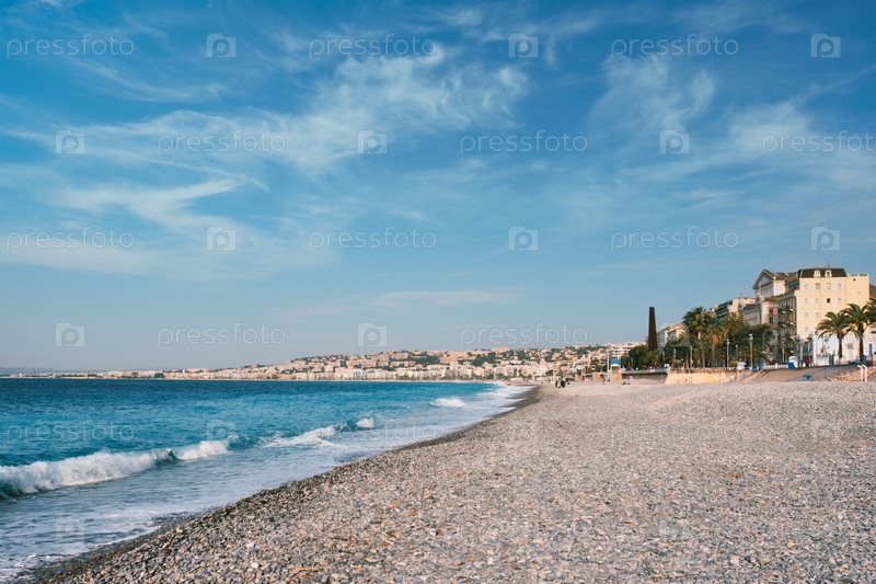 Пляж с гальками утром в Ницце, Франция
